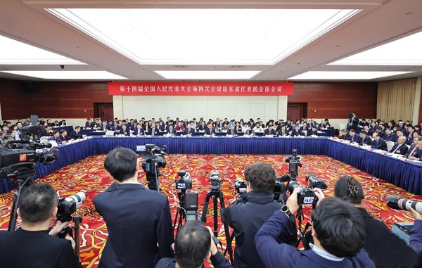 3月6日下午,十四届全国人大四次会议山东省代表团举行全体会议,继续审议政府工作报告,审查“十五五”规划纲要草案,并向中外媒体开放。