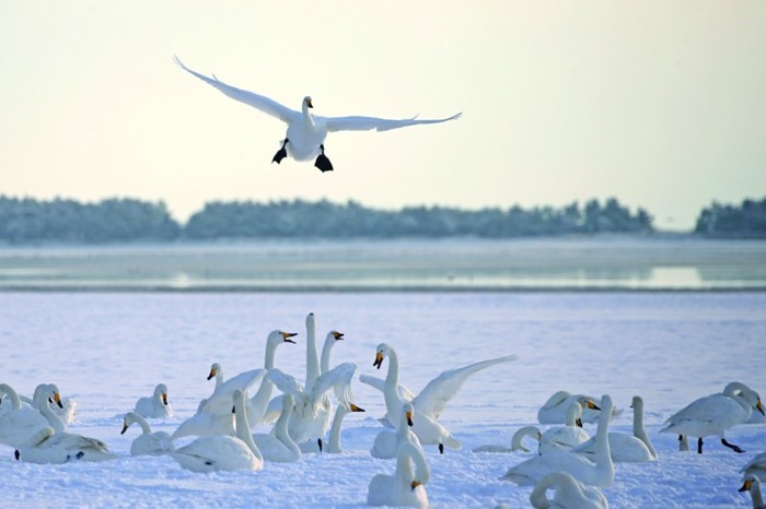 11日,大天鹅在雪后的荣成市成山镇西霞口隆霞湖公园栖息、游弋、觅食。新华社发