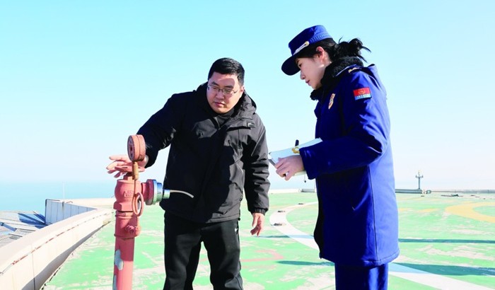 烟台市超高层建筑火灾隐患整治检查组正在检查楼顶停机坪室外消火栓 消防供图