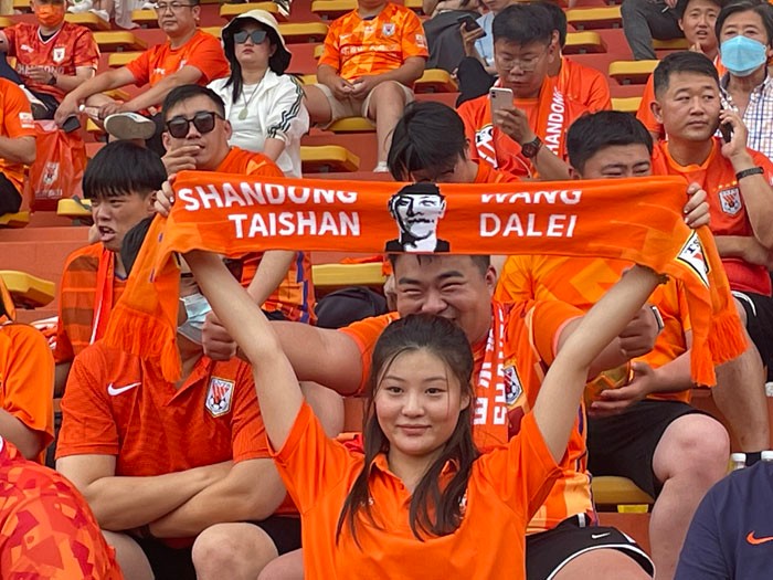 “老崔而立,泰山加油!”下午5点多,伴随泰山队球员的出现,看台上的球迷们集体拉起横幅,喊起加油口号。泰山队则是在队长郑铮的带领下集体致意。作为韩国人,崔康熙显然不明白“老崔而立”是什么意思,一边翻译似乎是在向他解释这句口号的意思,看起来,老崔似乎是明白了这句口号的意思。