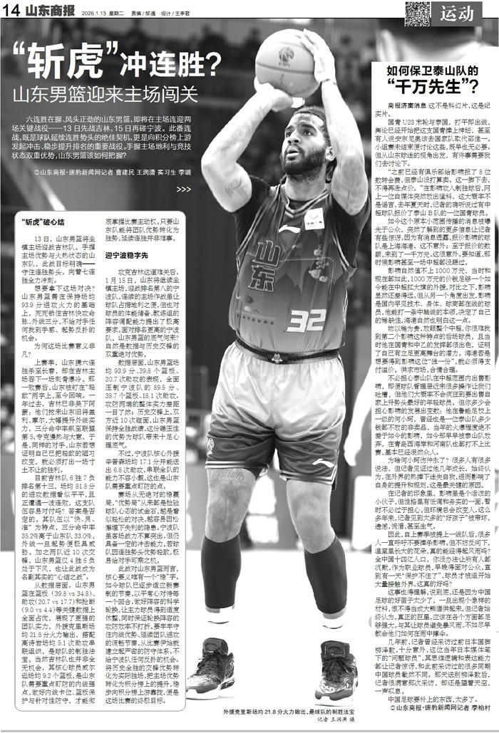 六连胜在握、风头正劲的山东男篮,即将在主场连迎两场关键战役——13日先战吉林,15日再碰宁波。此番连战,既是球队延续连胜势头的绝佳契机,更是向积分榜上游发起冲击、稳步提升排名的重要战役。手握主场地利与竞技状态双重优势,山东男篮该如何把握?
